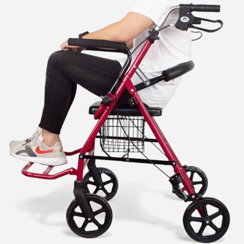 O assento acolchoado e o encosto confortável permitem repouso imediato sempre que o utilizador sentir necessidade de descansar. As alças anatómicas asseguram uma pega firme e ergonómica, enquanto a altura ajustável permite adaptar o andarilho às necessidades de cada pessoa, promovendo uma postura correta e evitando desconfortos durante a marcha.